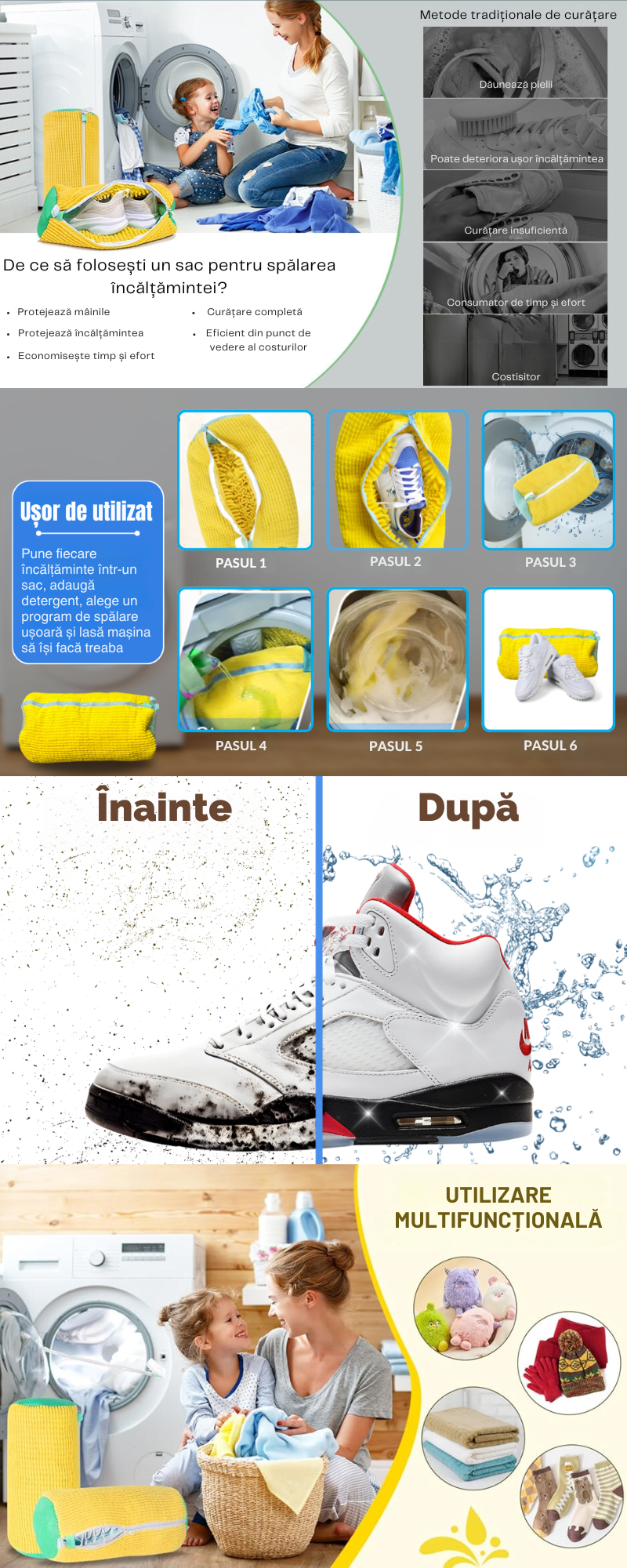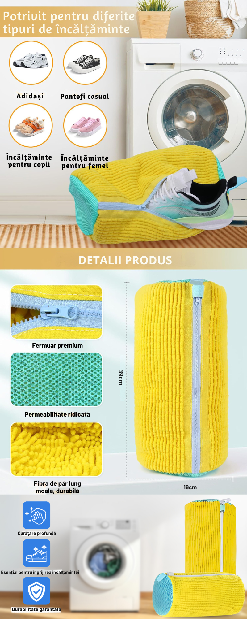 Sac pentru Spalare Incaltaminte, Reutilizabil, Protectie Anti-Zgarieturi, Anti- Deteriorare, potrivit pentru toate tipurile de incaltaminte si toate marimile, Galben